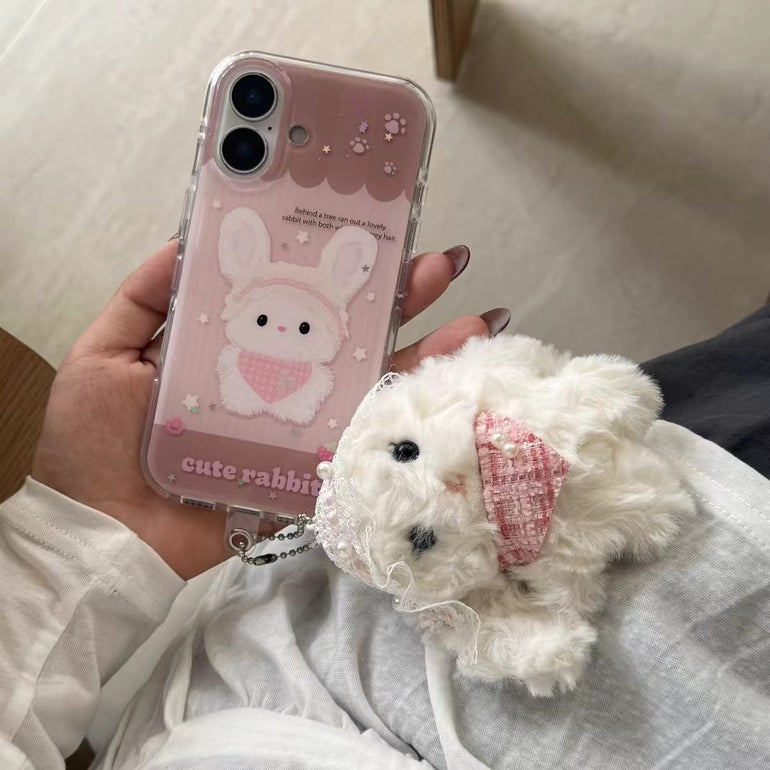 Cute Rabbit Printed iPhone Case with Plush Bunny Charm