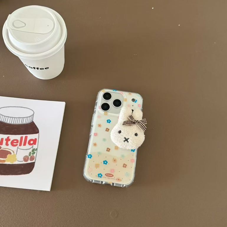 Give your phone a cute and cozy look with this pastel patterned iPhone case, paired with an adorable plush bunny charm.