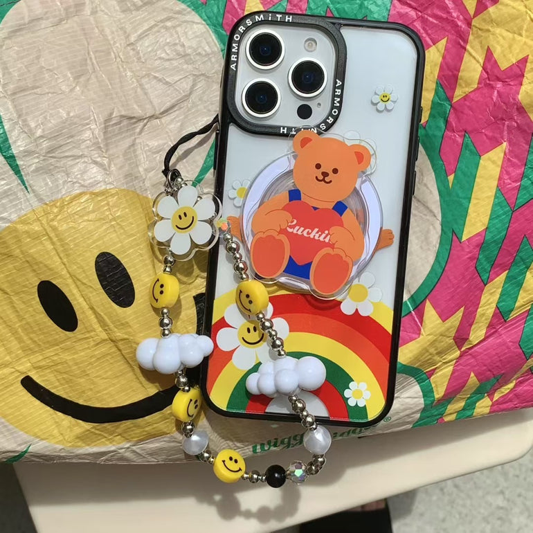 Smiley Daisy & Rainbow Bear iPhone Case with MagSafe Holder & Charm – Cute & Colorful Design