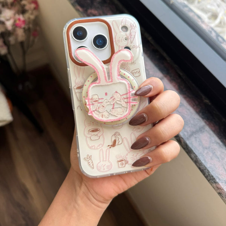 Add a fun and playful touch to your phone with this Cute Bunny iPhone Case, featuring adorable doodle-style bunny illustrations and a 3D bunny MagSafe holder in soft pastel pink. The clear background keeps your phone’s original look while adding a dose of cuteness and extra grip for everyday comfort.