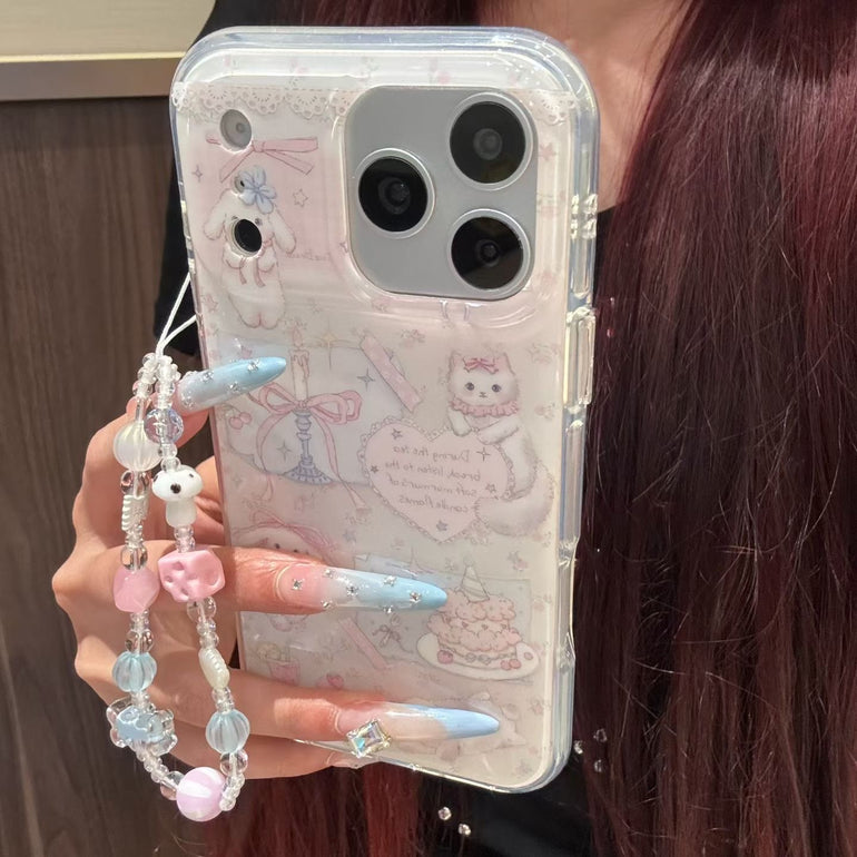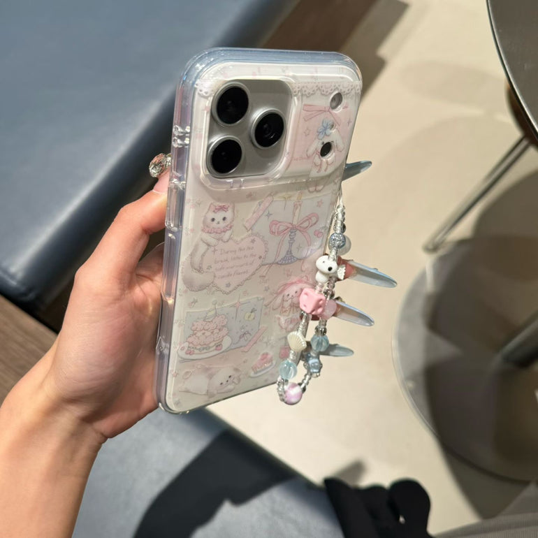 Add a soft and dreamy touch to your iPhone with this pastel aesthetic case featuring cute bunny and teddy illustrations with delicate detailing. Paired with a stylish beaded charm strap, this case is perfect for those who love subtle, elegant and kawaii-style designs.