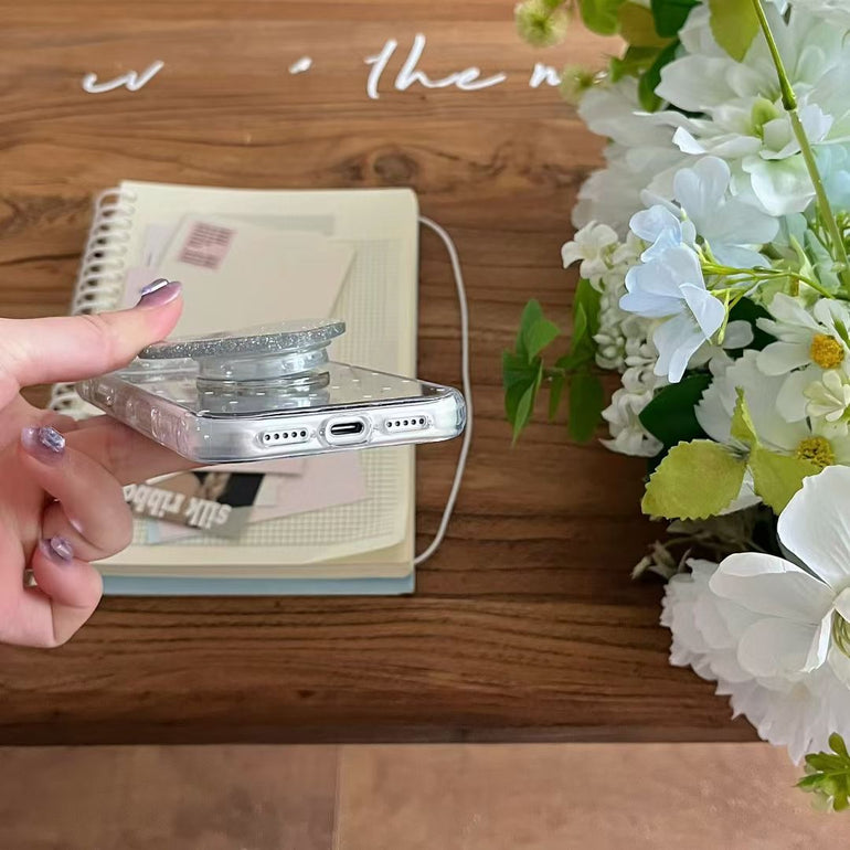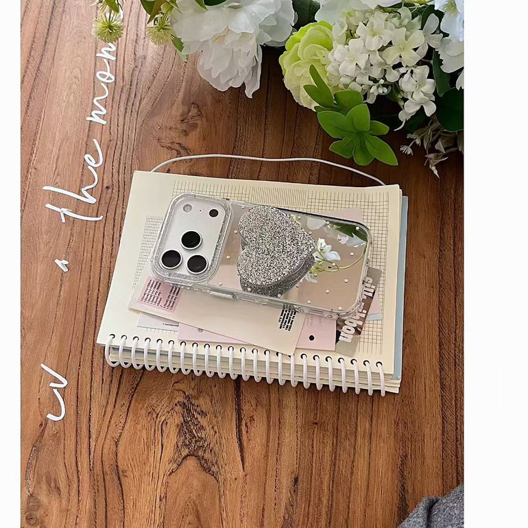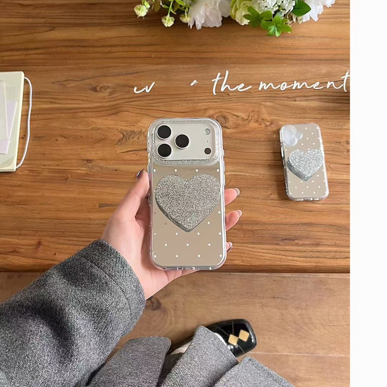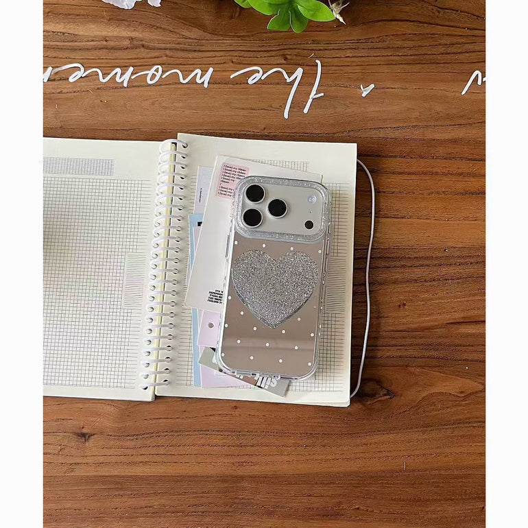 Give your phone a stylish upgrade with this polka dot mirror iPhone case featuring a cute heart holder. The reflective mirror back adds a chic touch while the holder provides a secure grip and doubles as a stand for easy viewing. Perfect blend of fashion and functionality for everyday use.