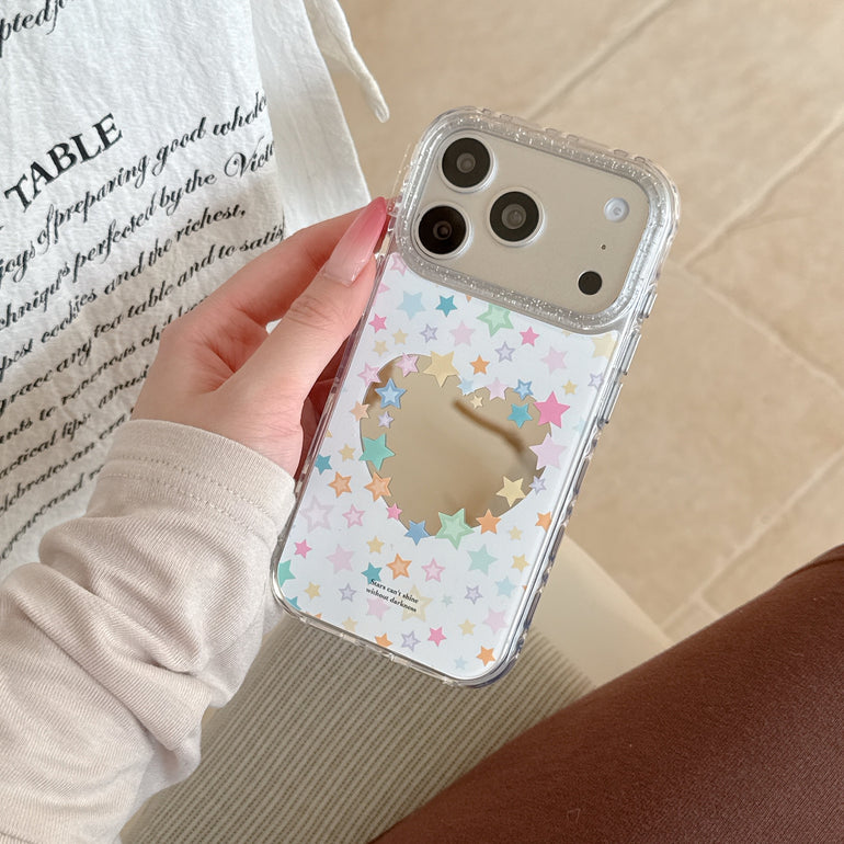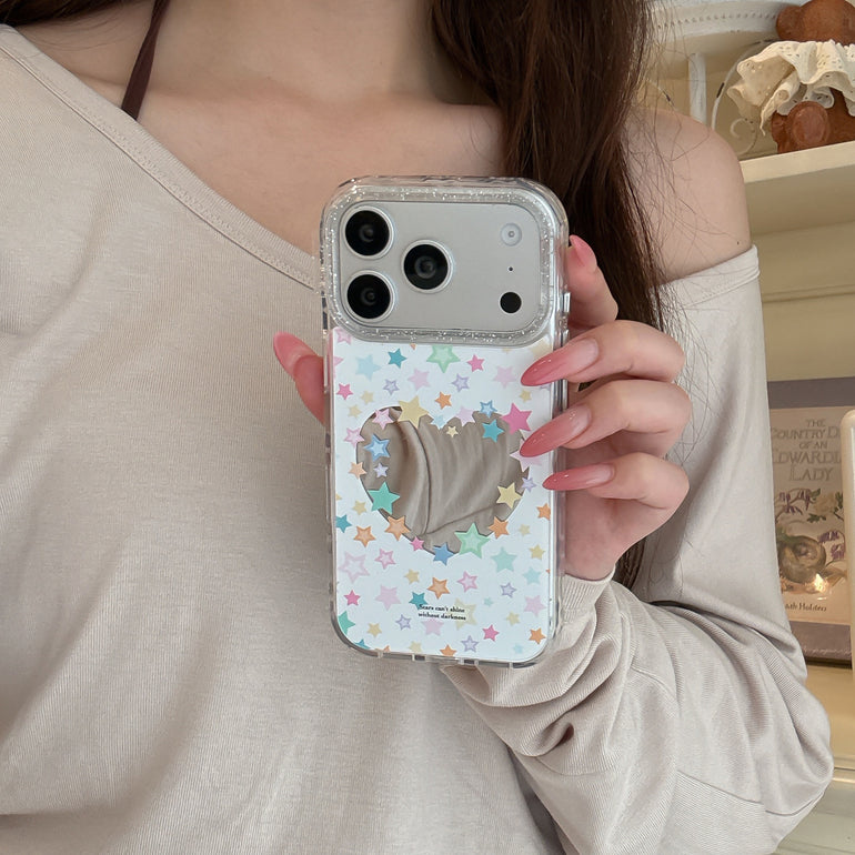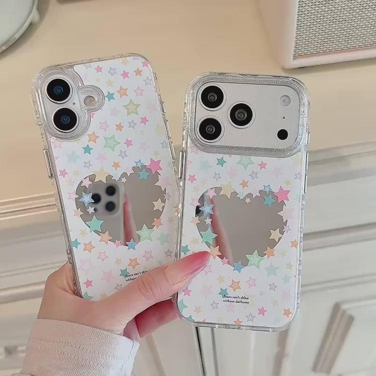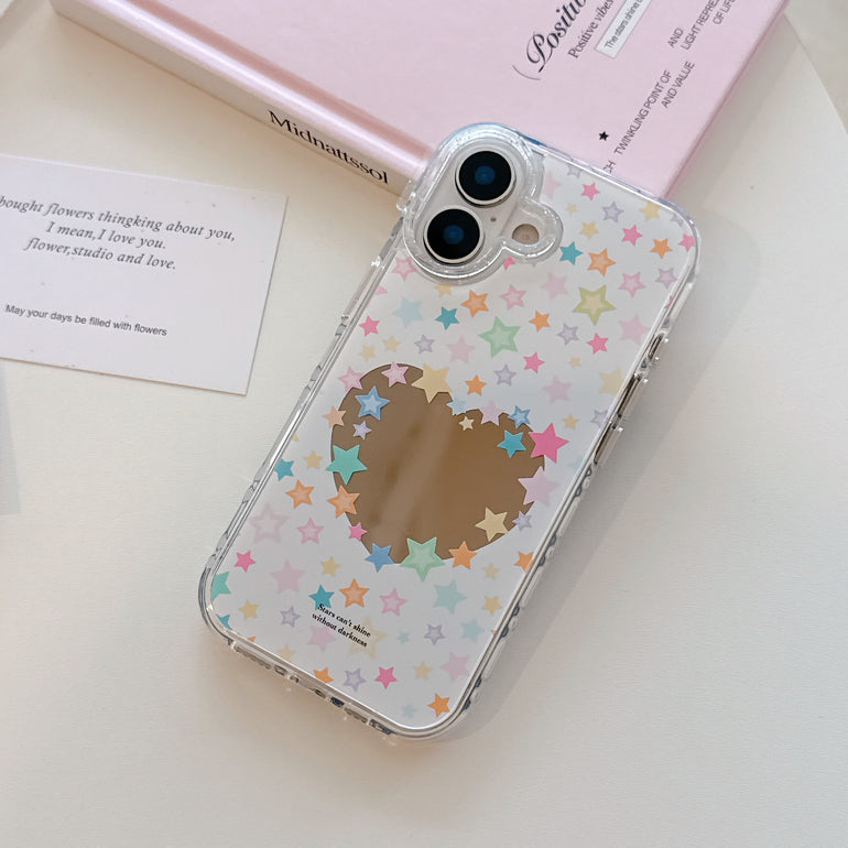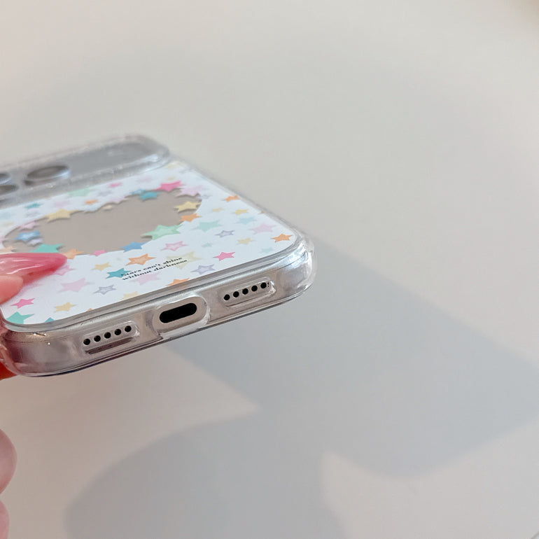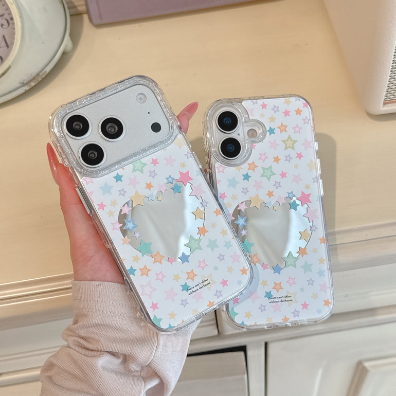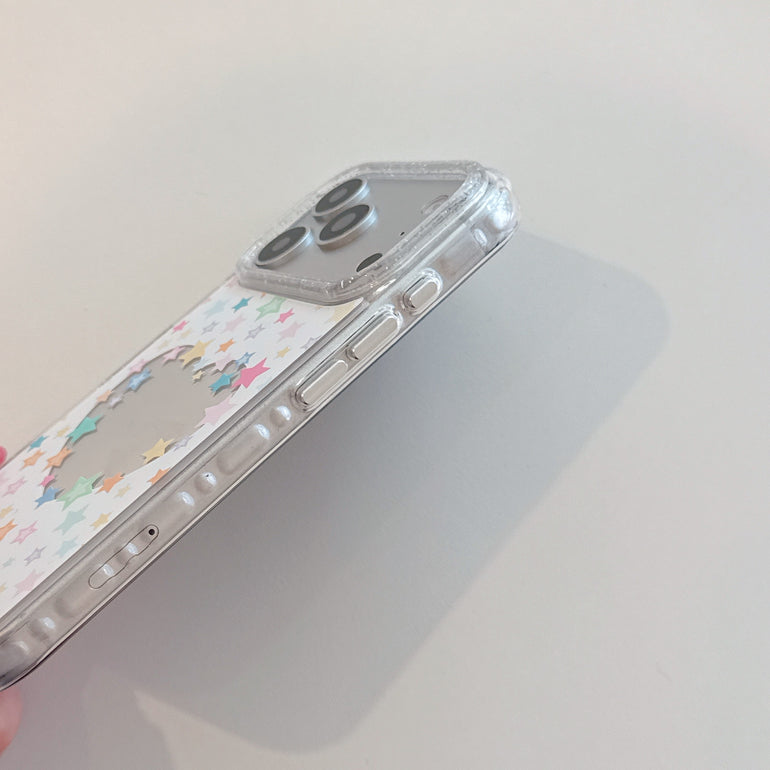 Add a playful yet stylish touch to your phone with this star heart mirror iPhone case. Designed with colorful pastel stars and a heart-shaped mirror center, this case combines aesthetics with functionality. Perfect for quick touch-ups on the go while keeping your phone protected.