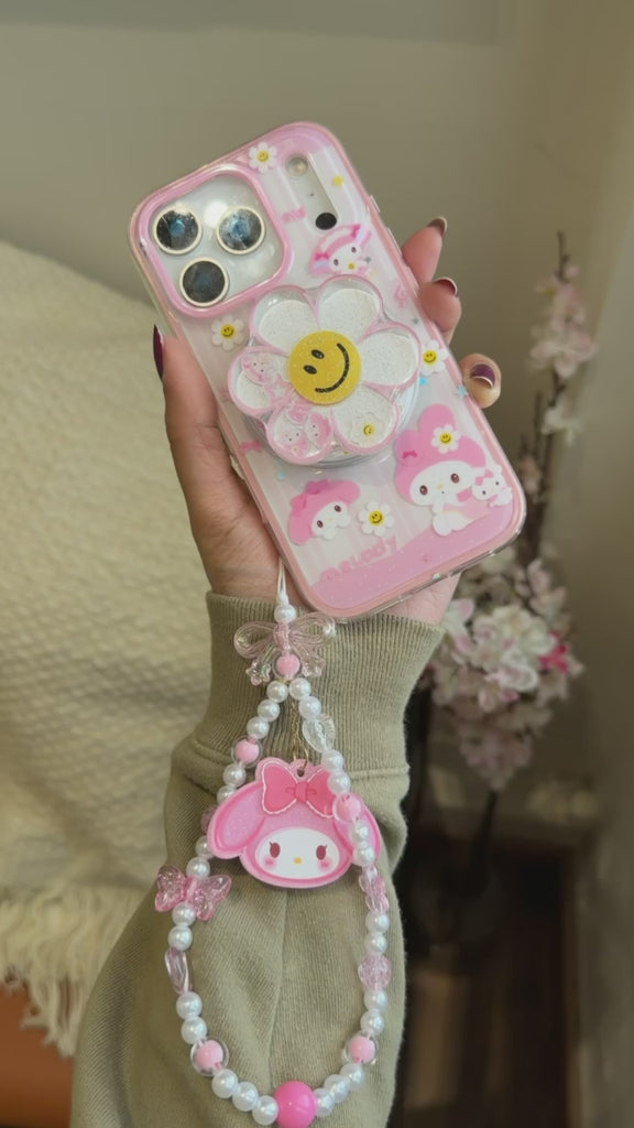 Give your phone a cute and functional upgrade with this pink aesthetic iPhone case featuring a MagSafe holder. The case comes with a smiley flower MagSafe holder, adorable cartoon elements, and a pearl beaded wrist strap for style and convenience.