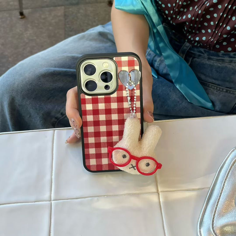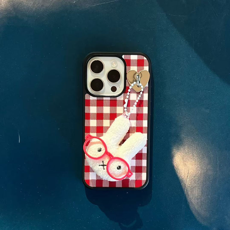Give your phone a cozy, playful look with this Red Gingham Bunny iPhone Case featuring a soft plush bunny wearing red glasses. The red checkered background adds a cute vintage touch, while the attached plush charm brings personality and fun to your everyday style.