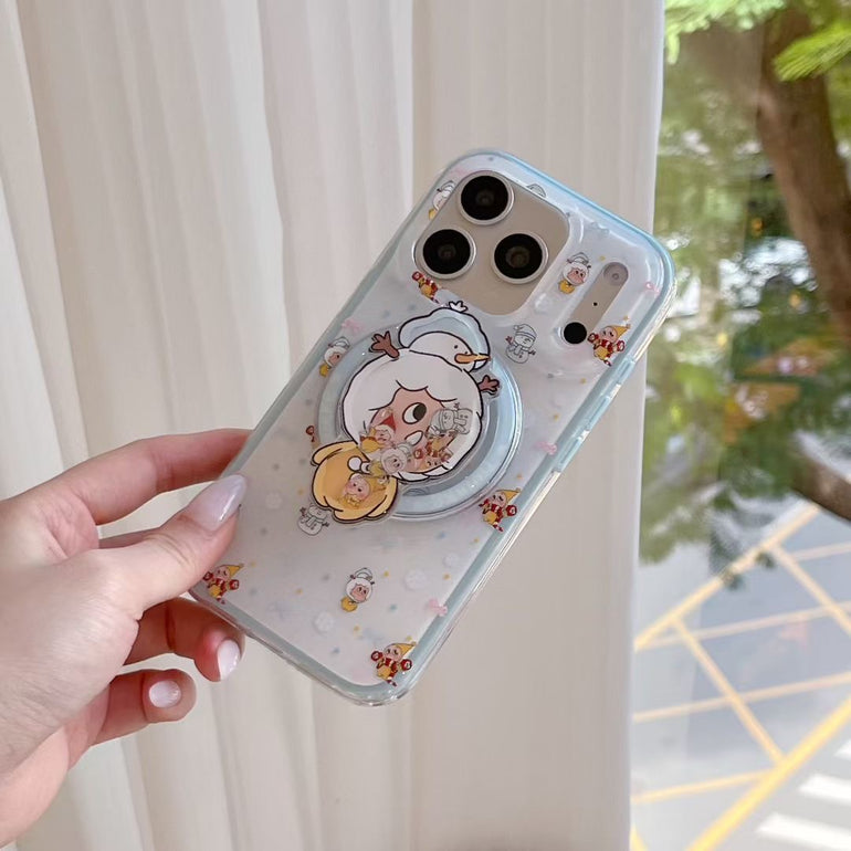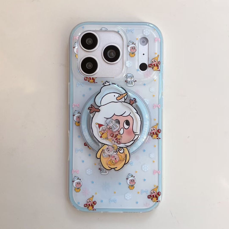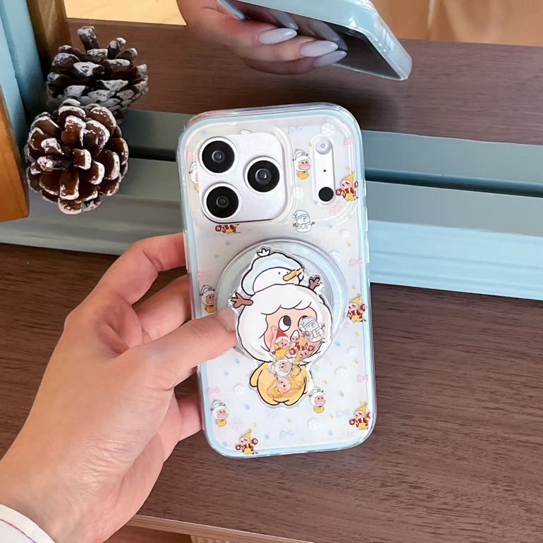 Add a cozy winter vibe to your phone with this cute cartoon iPhone case featuring an adorable winter character print and a built-in MagSafe holder. The circular holder doubles as a secure grip and stand, making it stylish and functional for daily use.