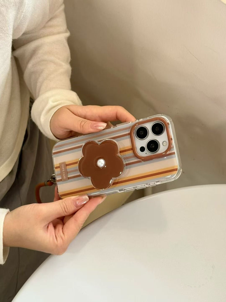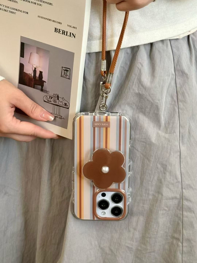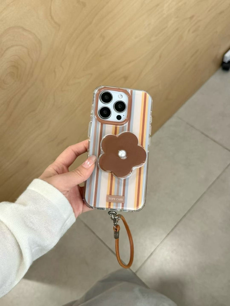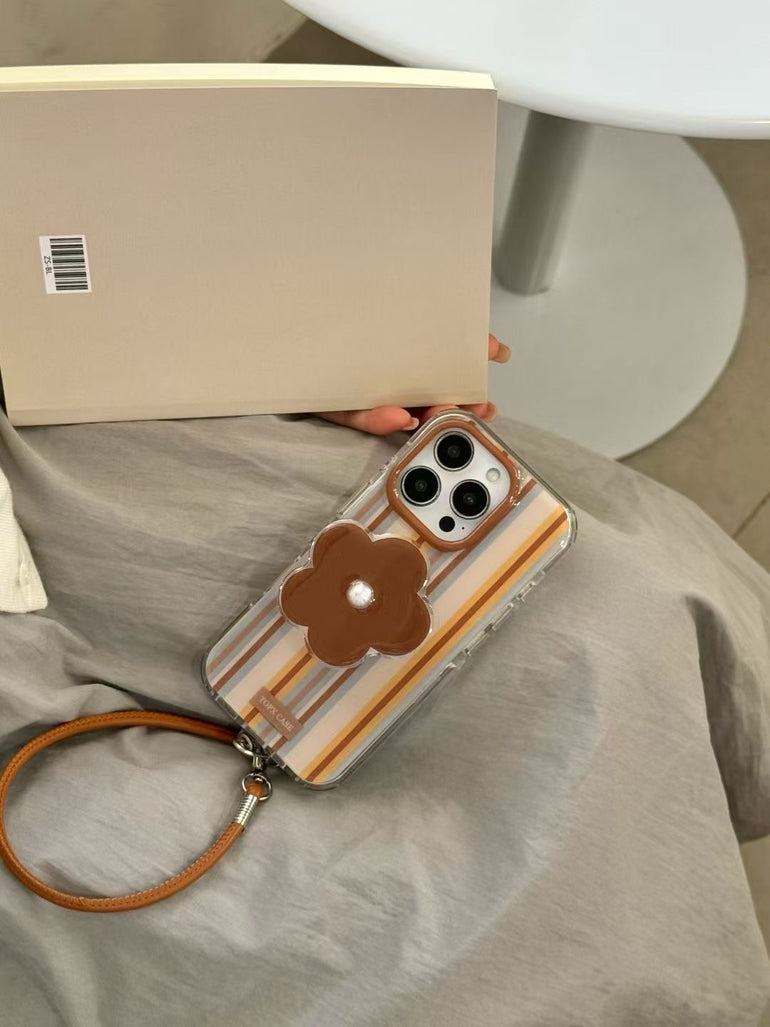 Keep your iPhone stylish and secure with this striped floral case, featuring a chic brown flower design with a pearl centerpiece. The transparent base with colorful stripes adds a trendy vibe, while the detachable leather wrist strap makes carrying your iPhone effortless.