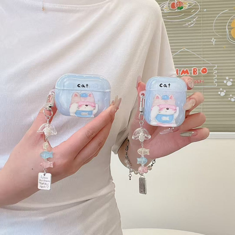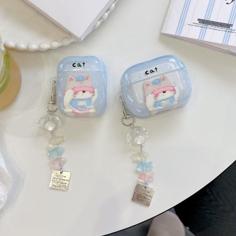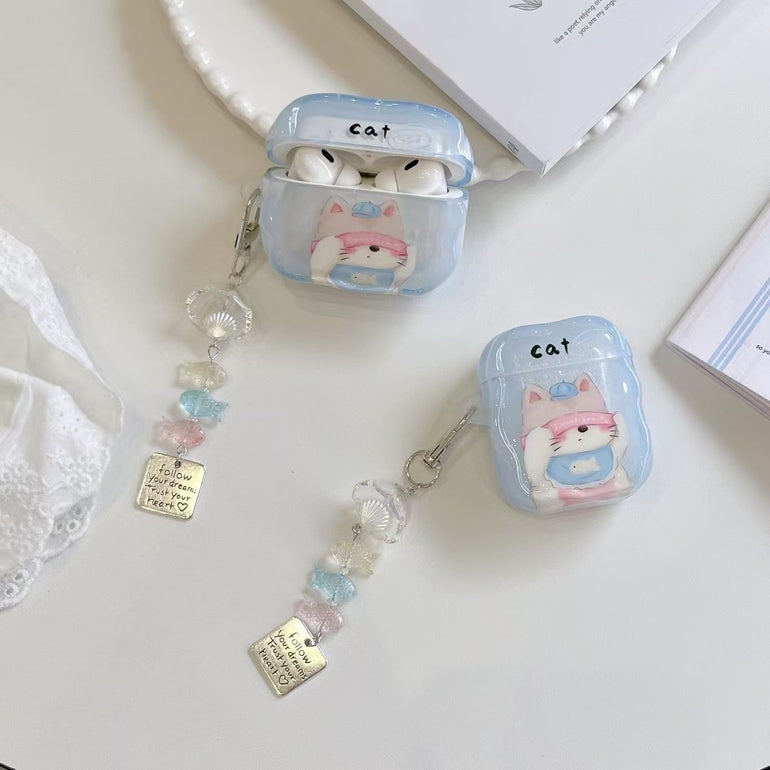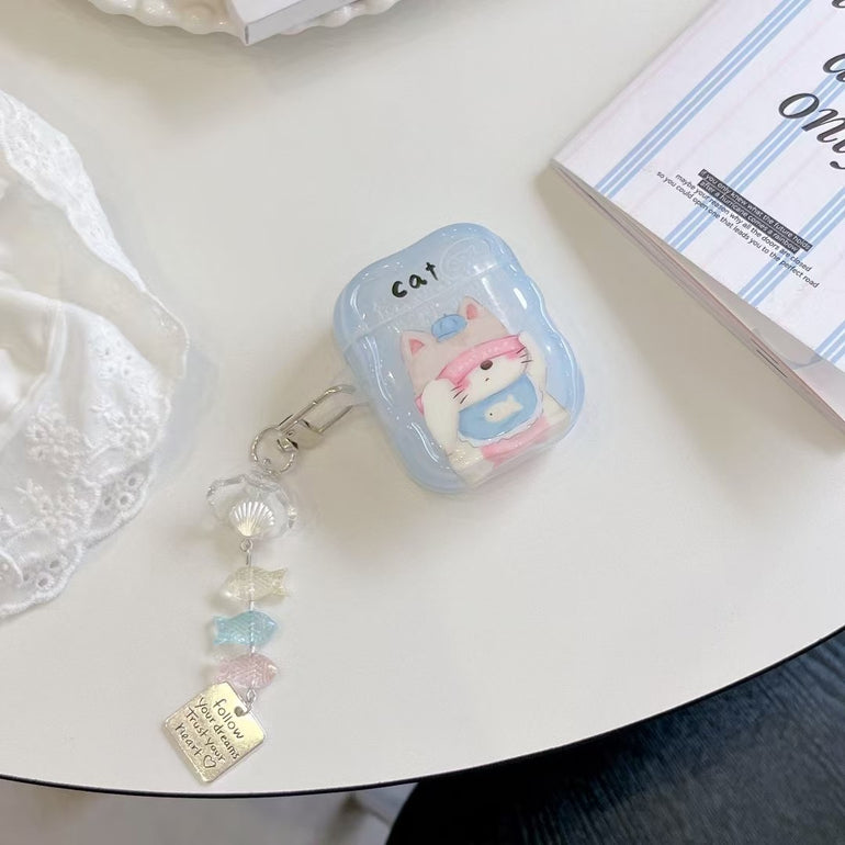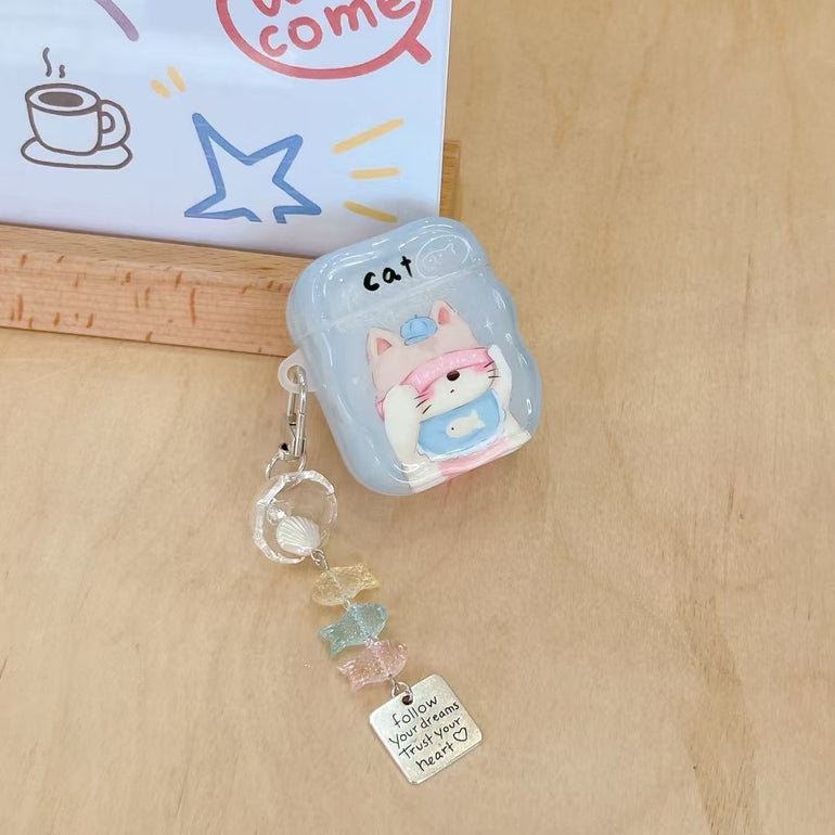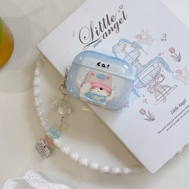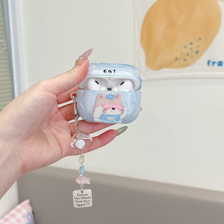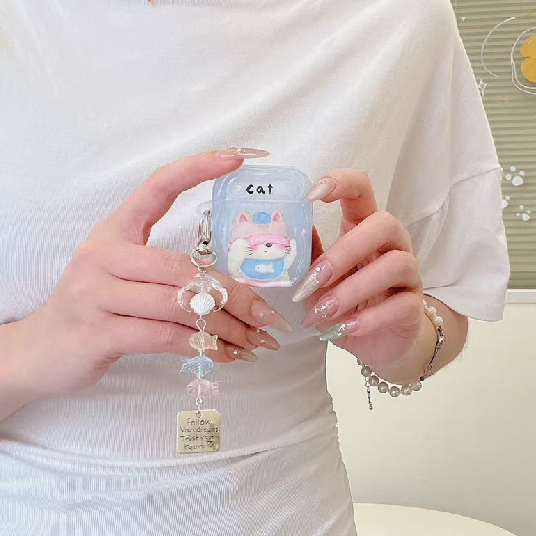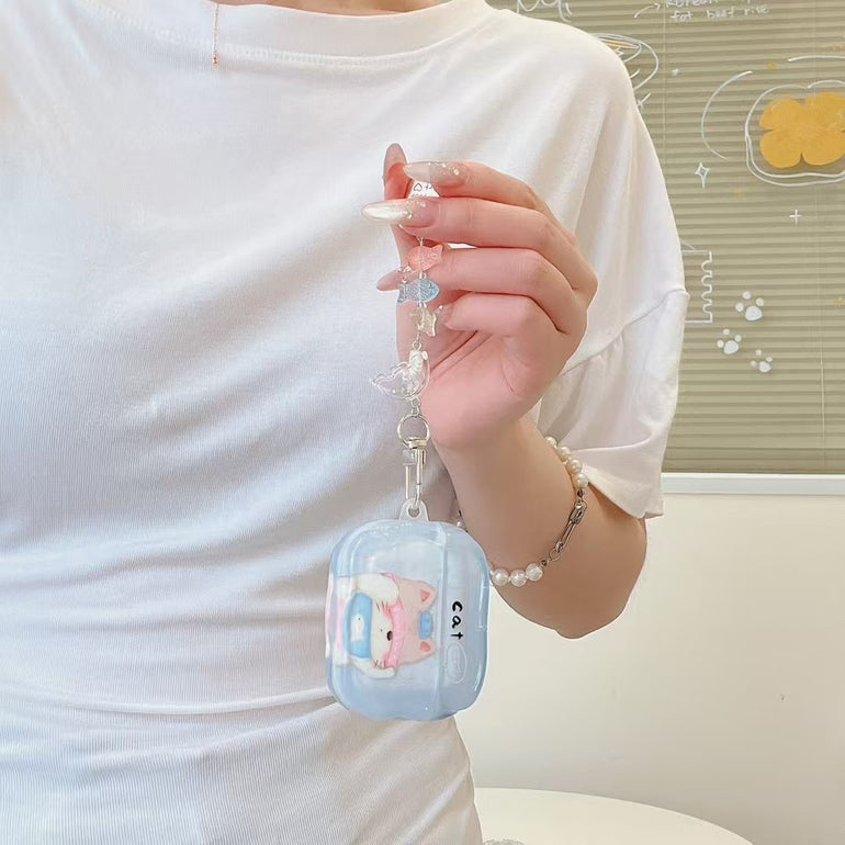 Adorable Cat 3D AirPods Case – Glossy Blue Protective Cover with Charm