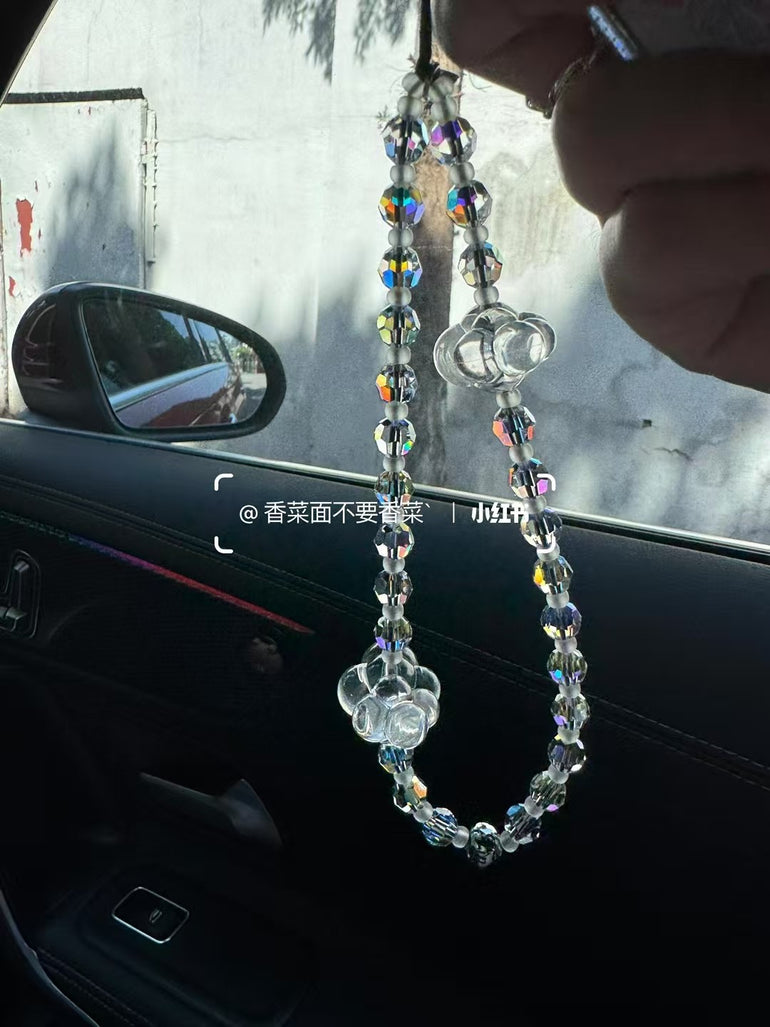 A detachable crystal bead charm strap featuring a glossy bear centerpiece and reflective finish
