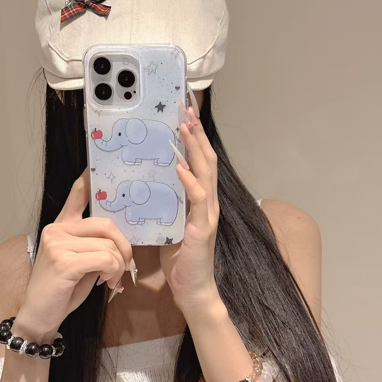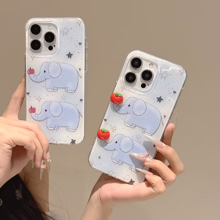 Cute Elephant iPhone Case – Glitter Clear Soft Case with 3D Apple Charm & Star Accents for iPhone