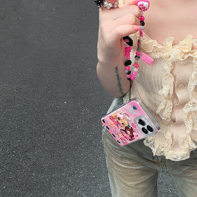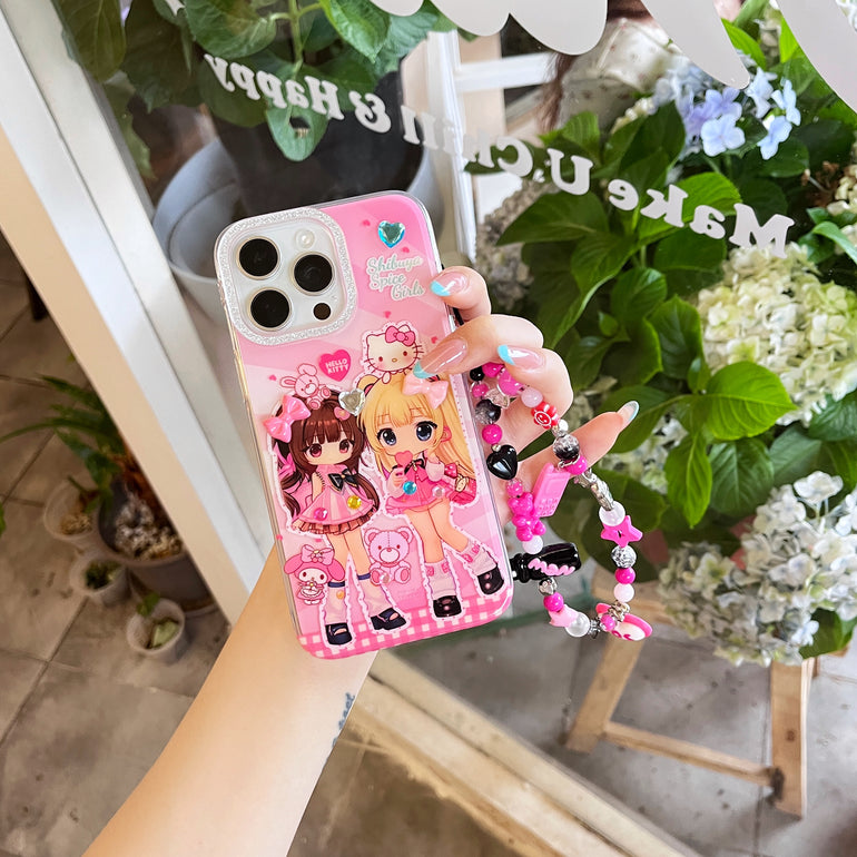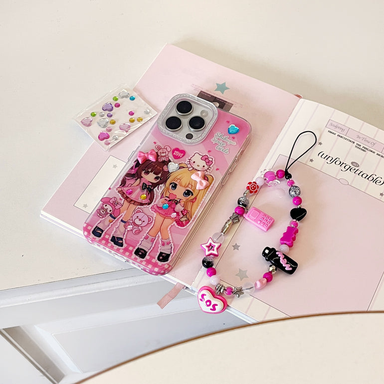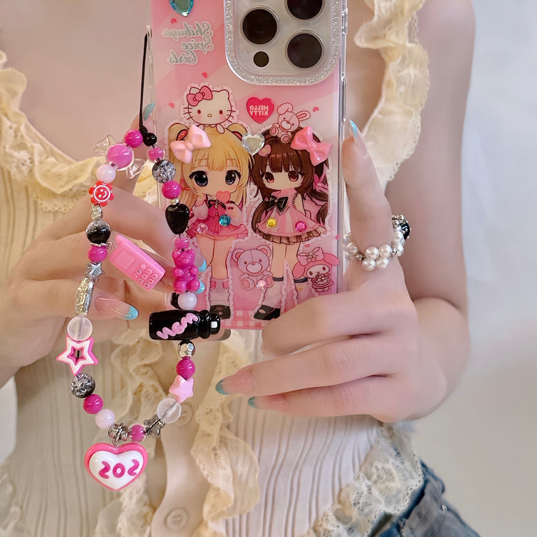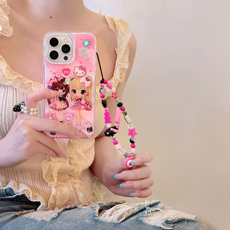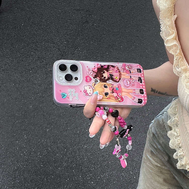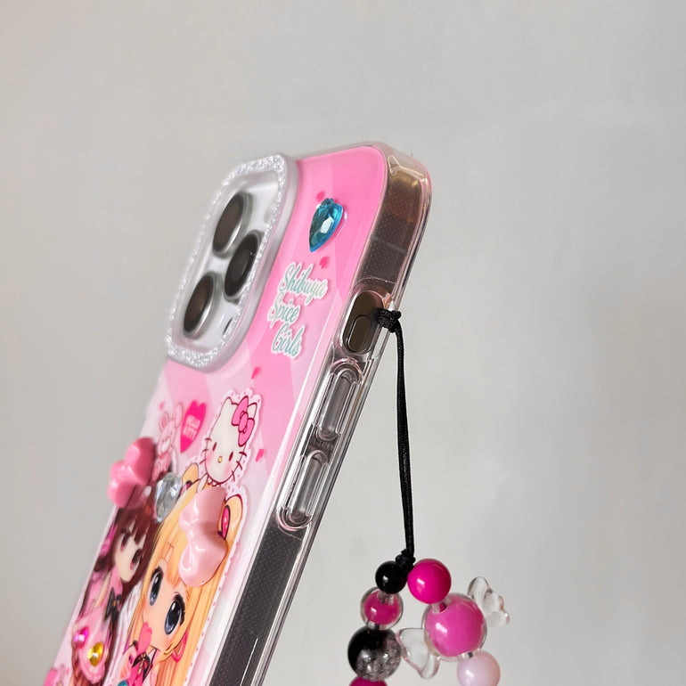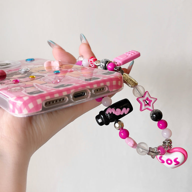 Cute Girls Pink Aesthetic iPhone Case with Beaded Charm – Cute 3D Bow & Character Design Cove