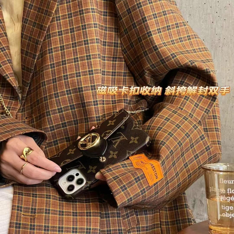 Luxury Branded Leather Wallet iPhone Case With Sling Chain