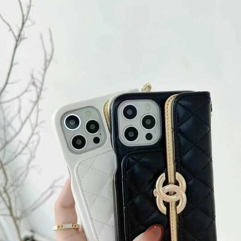 Luxury Branded Quilt Leather Wallet Case For iPhone With Sling Chain