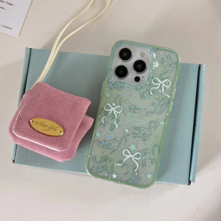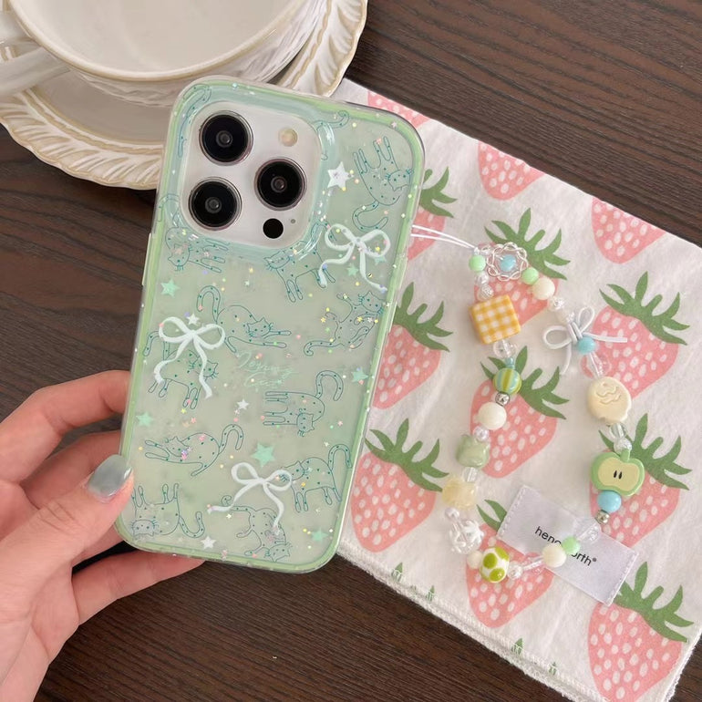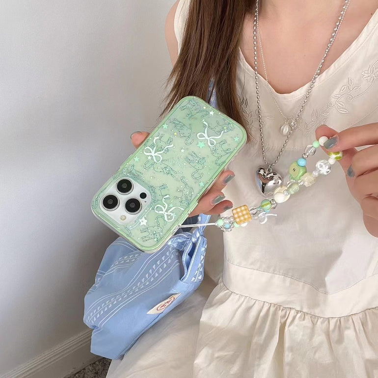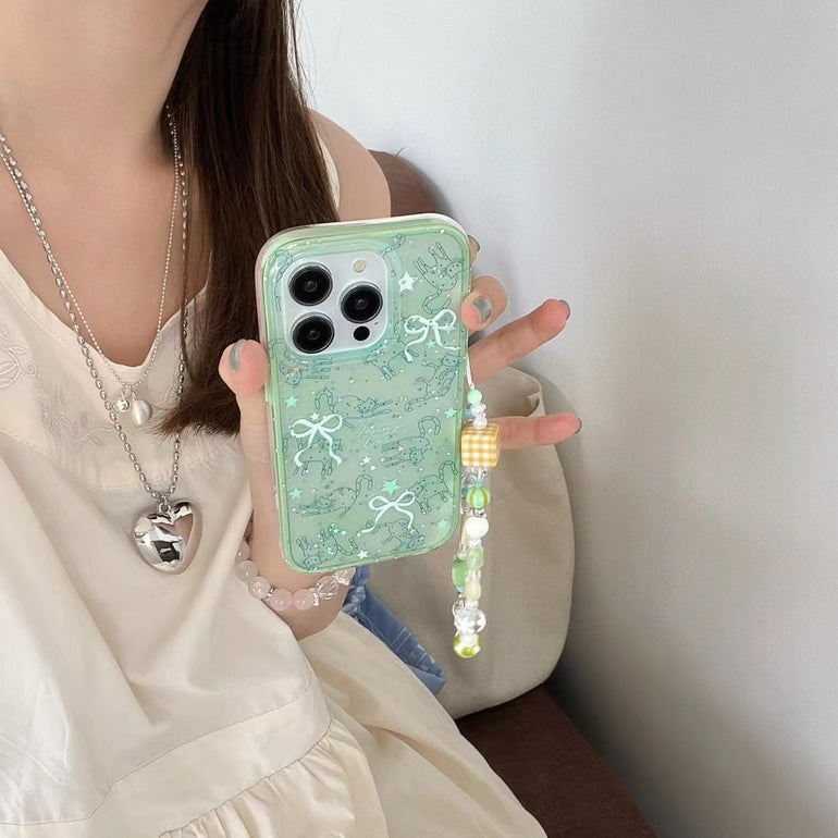 Mint Green Cartoon Dino iPhone Case With White Bows & Beaded Charm