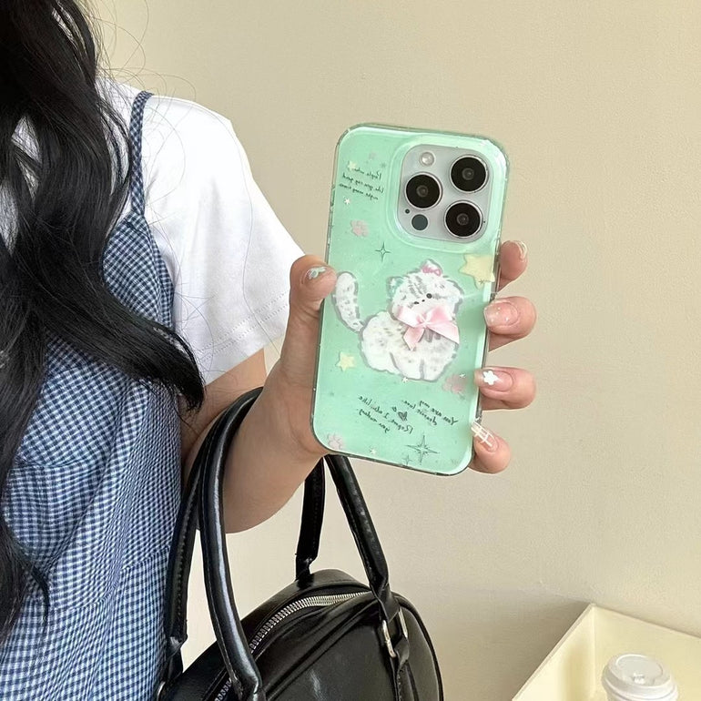 Mint Green Cute Cat iPhone Case – Soft Silicone Protective Cover with 3D Bow & Stars for iPhone