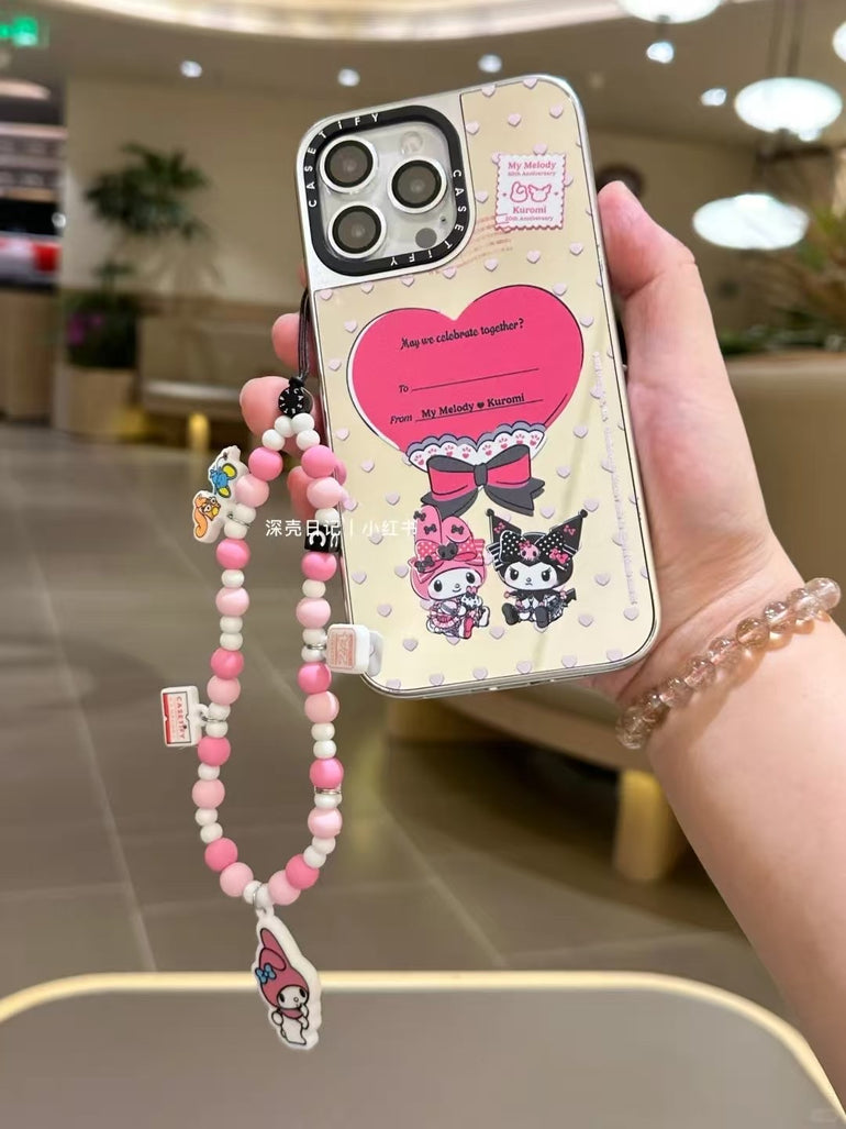 My Melody & Kuromi iPhone Case with Heart Design & Pink Beaded Charm Strap