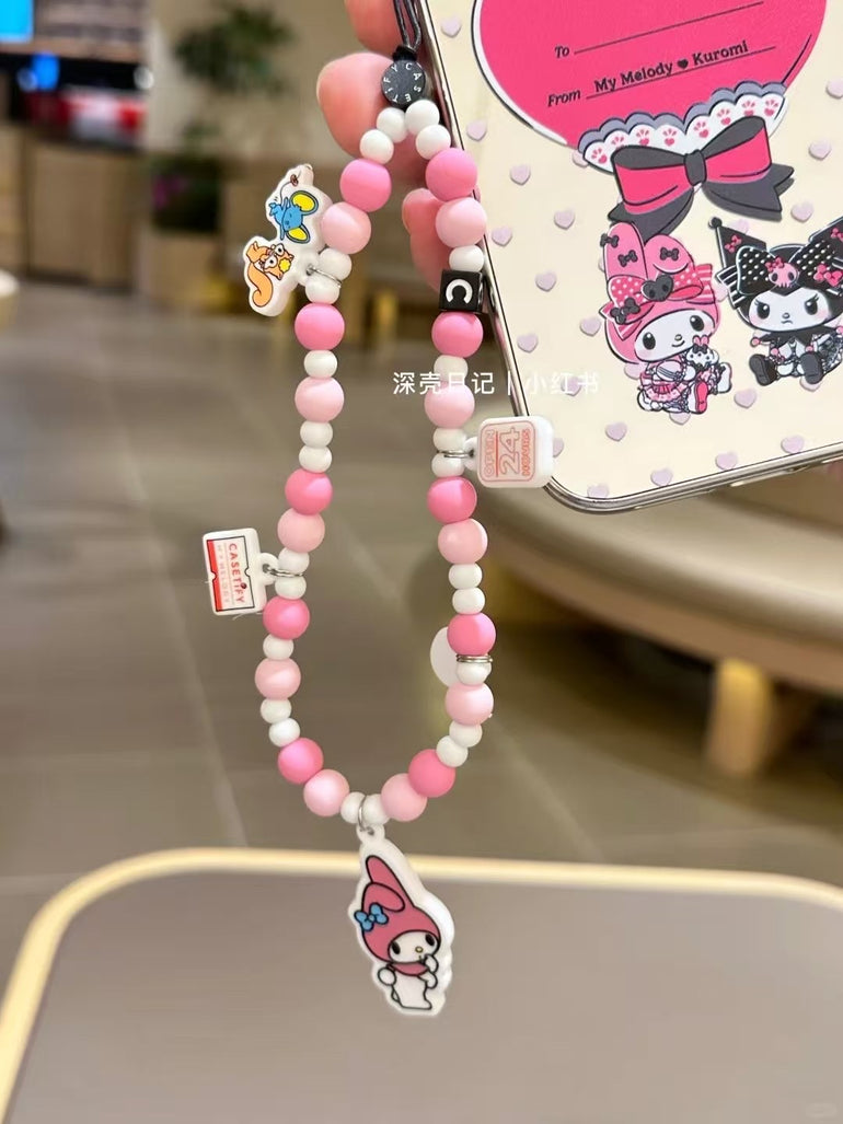 A pink-toned beaded charm strap featuring mini character pendants and soft matte beads for extra cuteness