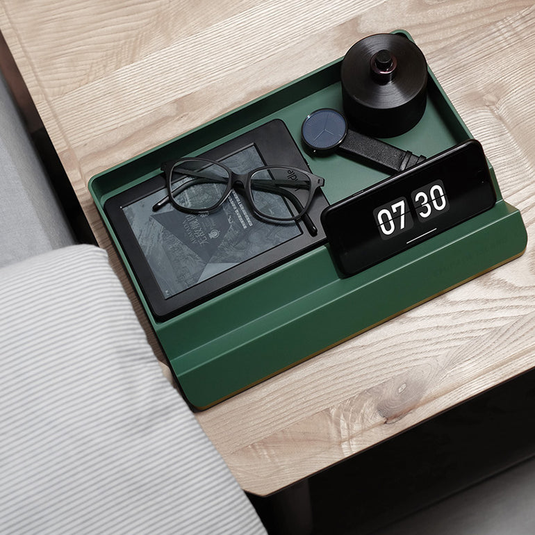Keep your bedside or workspace perfectly organized with this modern multifunctional organizer tray featuring a built-in digital clock stand. Designed for everyday essentials, it neatly holds your phone, glasses, books, watch, and accessories in one stylish place.