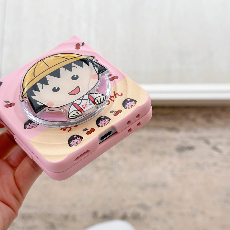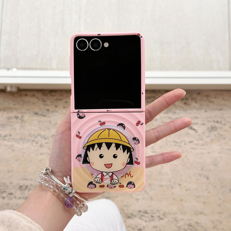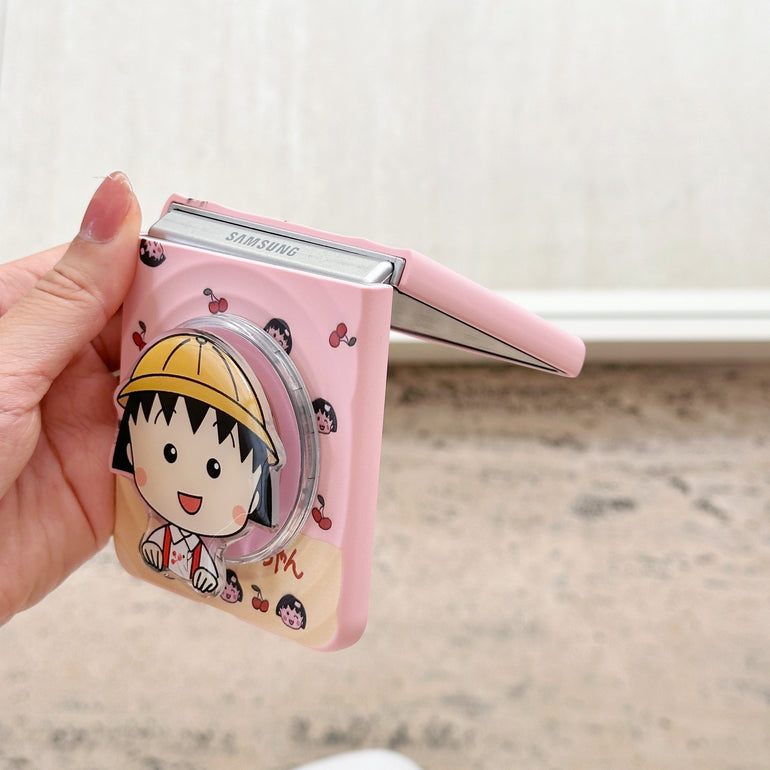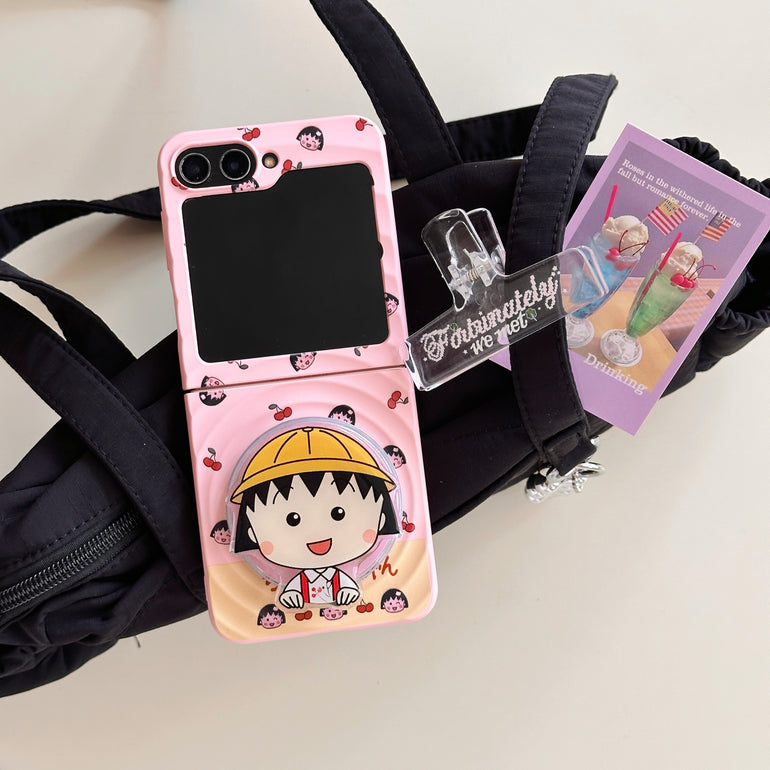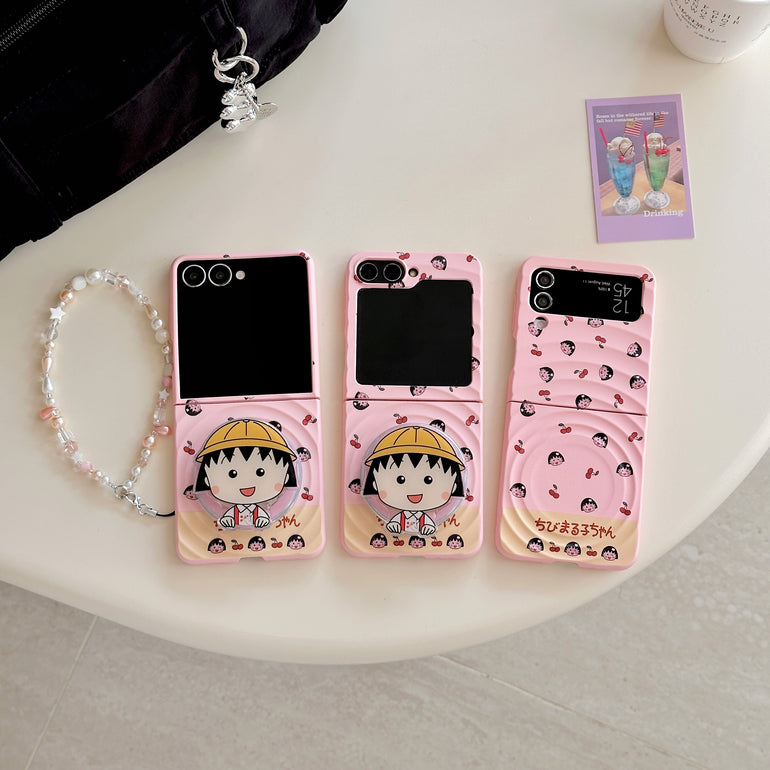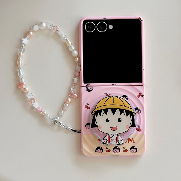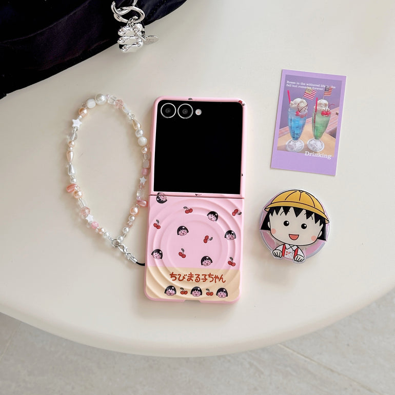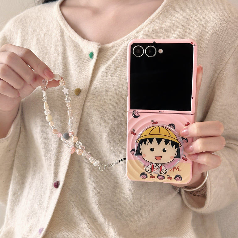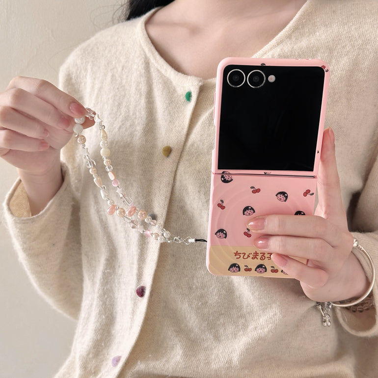Make your Samsung Z Flip stand out with this adorable cartoon girl case in pastel pink. Designed with playful cherry accents and a rotating pop grip, it adds both cuteness and comfort to your phone. The case also comes with a pearl-style beaded hand strap, making it stylish and easy to carry.