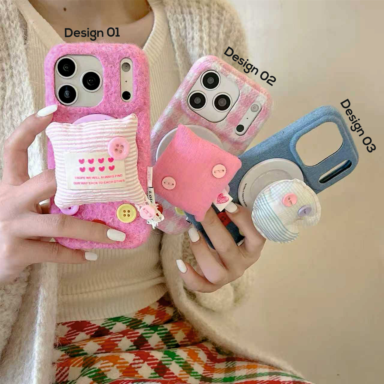 Cute Fabric MagSafe Holder iPhone Cover – Soft Plush & Button Design