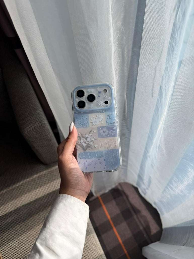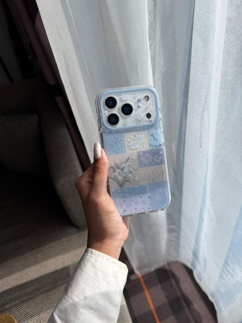 Blue Floral Patchwork iPhone Case – Aesthetic Printed Protective Cover