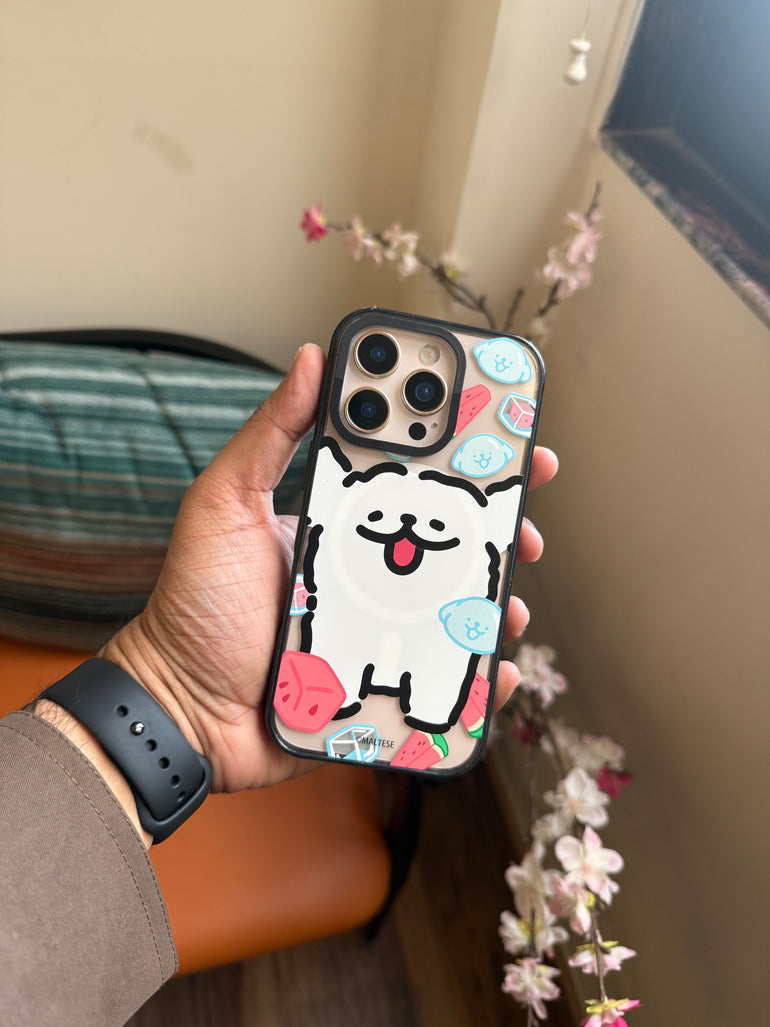 Make your phone instantly adorable with this cute puppy MagSafe iPhone case. Featuring a happy puppy illustration surrounded by playful watermelon and pastel icons, this design brings a fun, cheerful vibe to your everyday look.