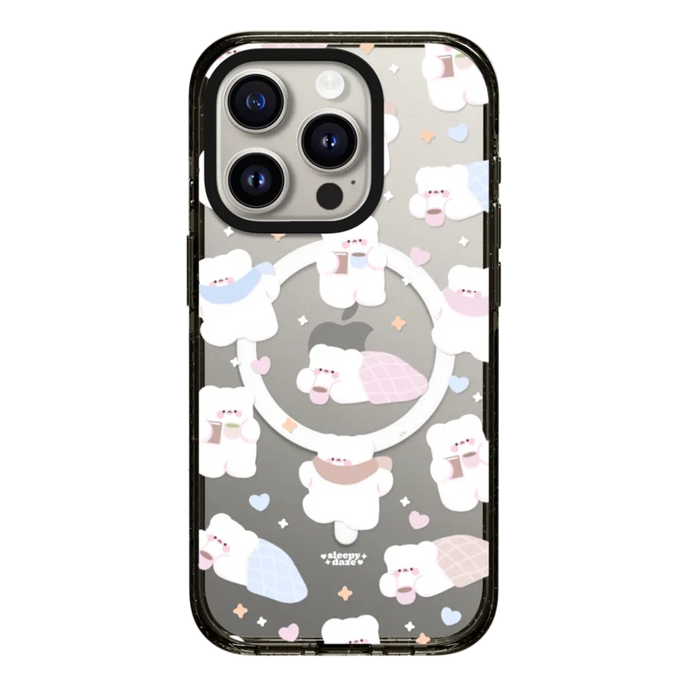 Wrap your phone in cozy cuteness with this sleepy bear print iPhone MagSafe case. Featuring adorable teddy bears relaxing, sleeping, and sipping drinks with tiny hearts and stars on a soft grey base, this design feels calm, comforting, and irresistibly cute.
