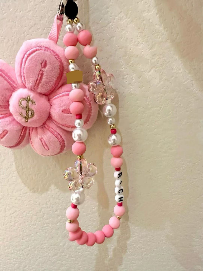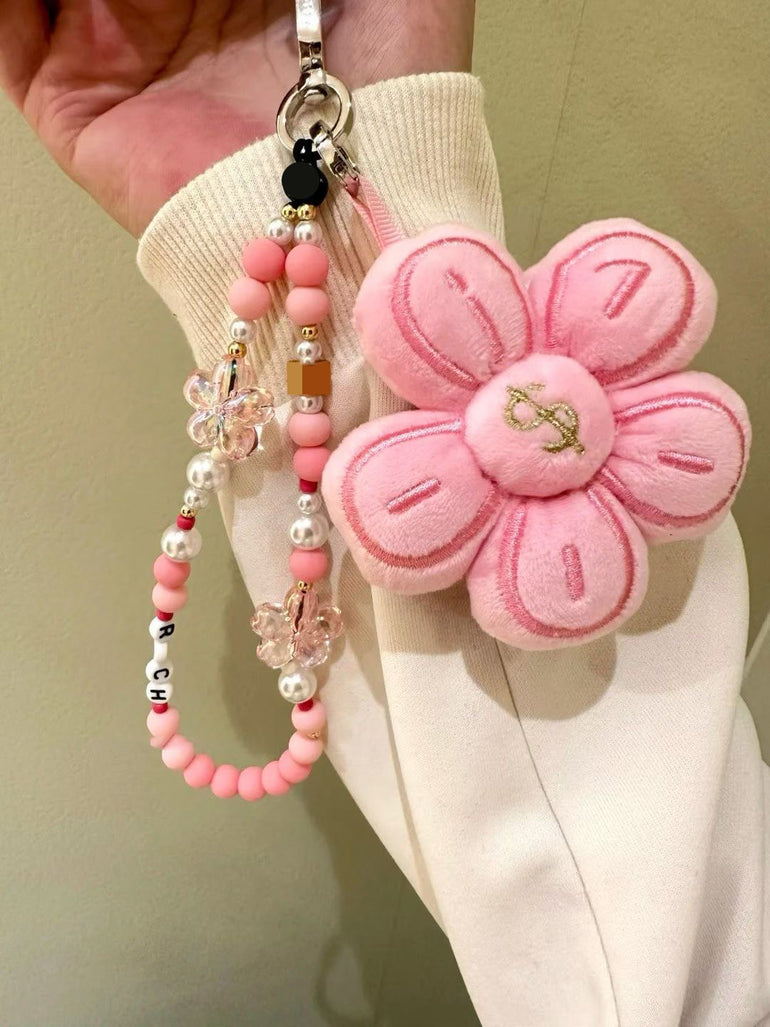 Elevate your phone styling with this pink flower plush charm, paired with a trendy beaded phone strap for the perfect mix of cute and chic.