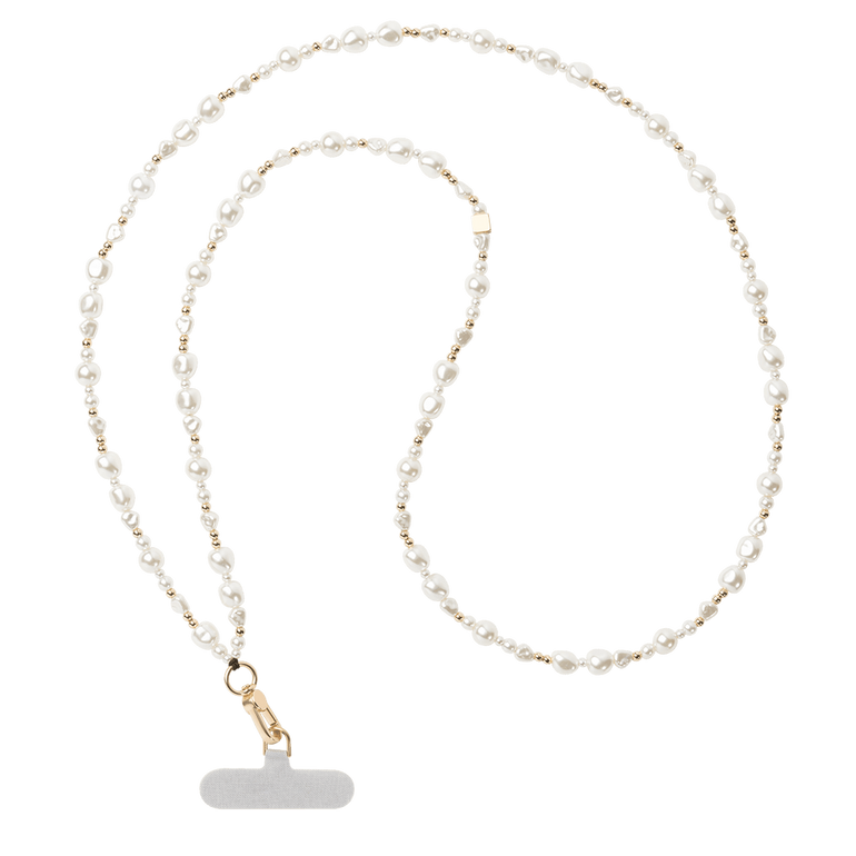 Classic Pearl Cross-Body Phone Charm – Elegant White Pearls with Gold Accents