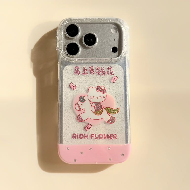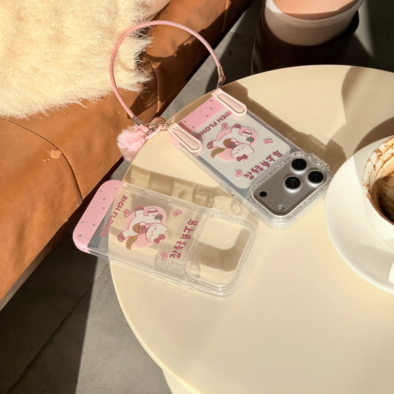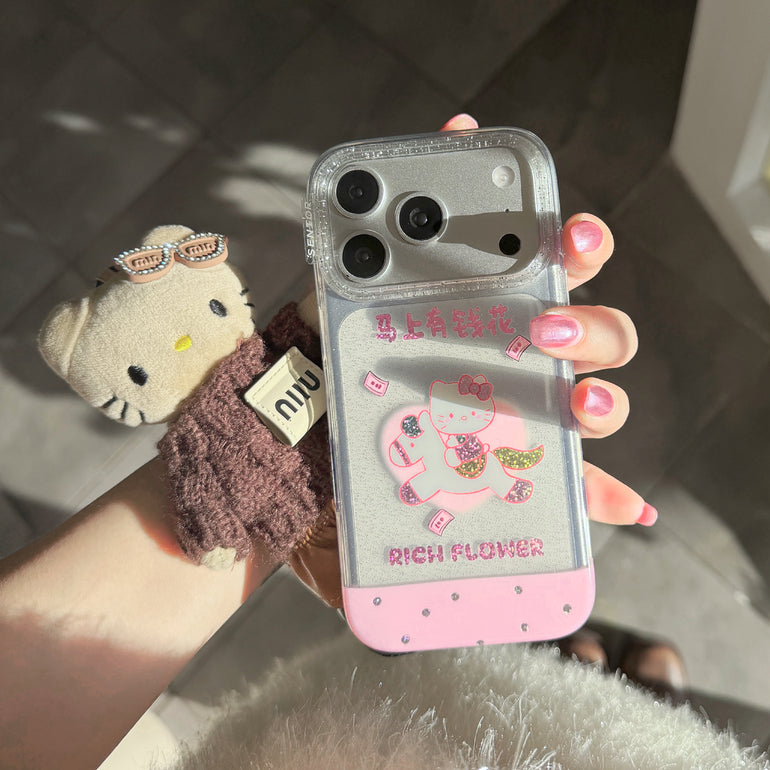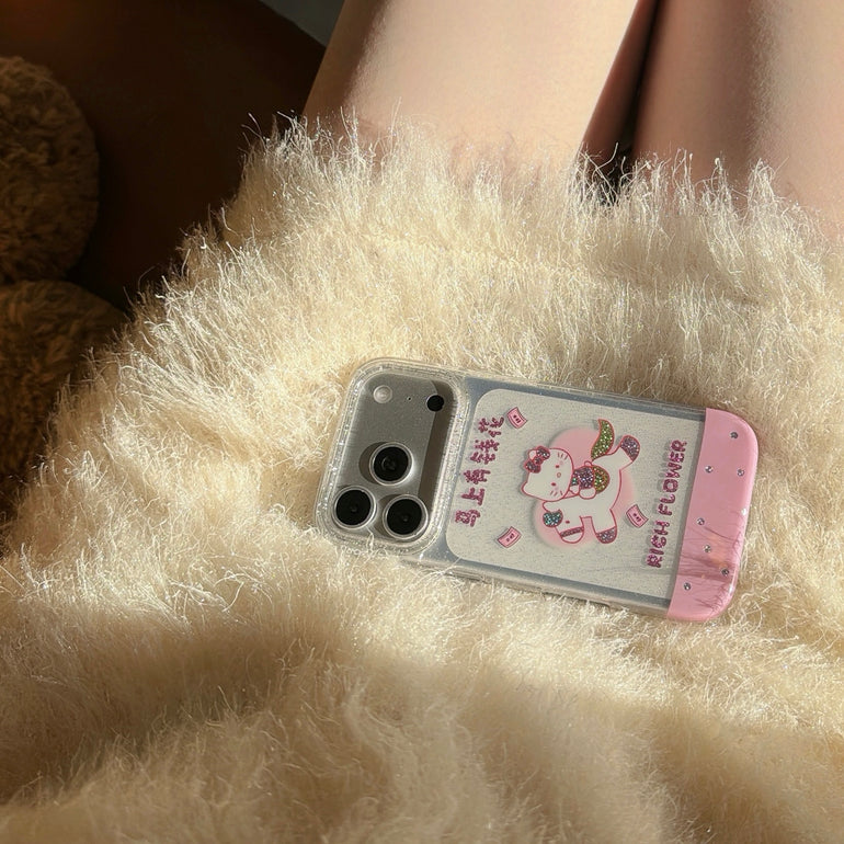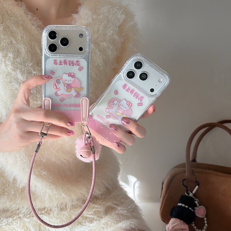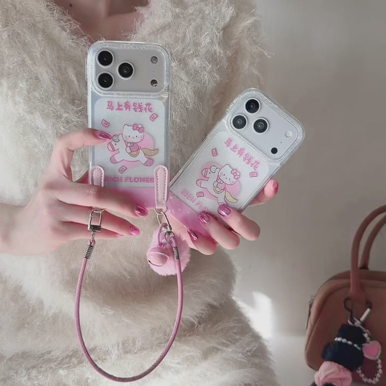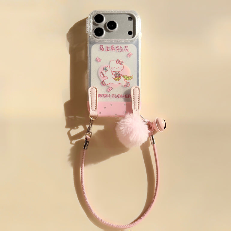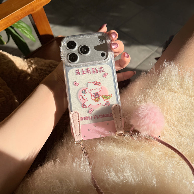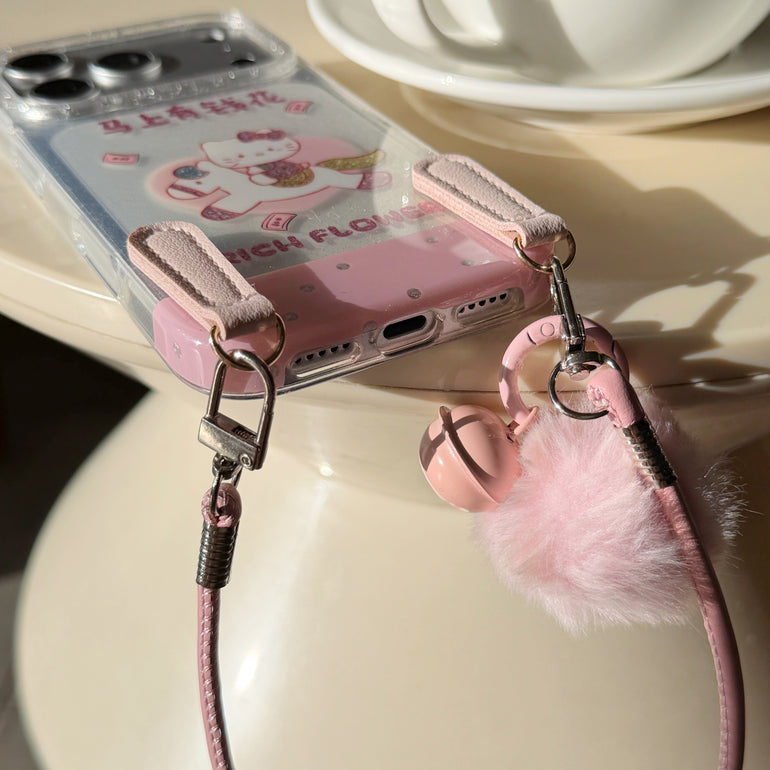 Add a cute and stylish touch to your phone with this kitty-themed iPhone case, designed with an adorable cartoon print, soft pink strap, and fluffy fur charm for a trendy aesthetic look.