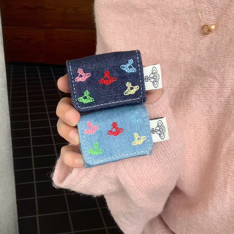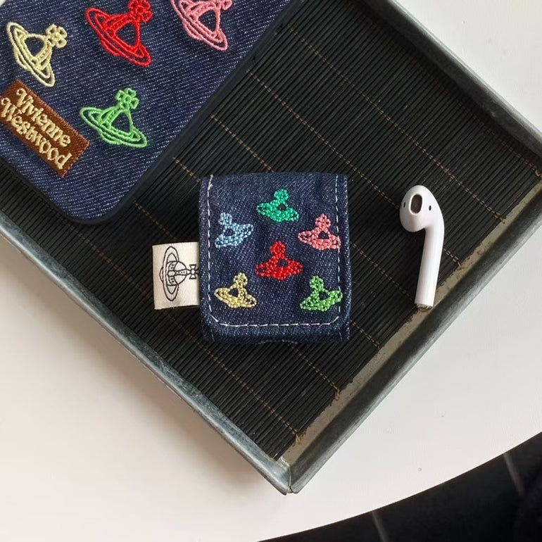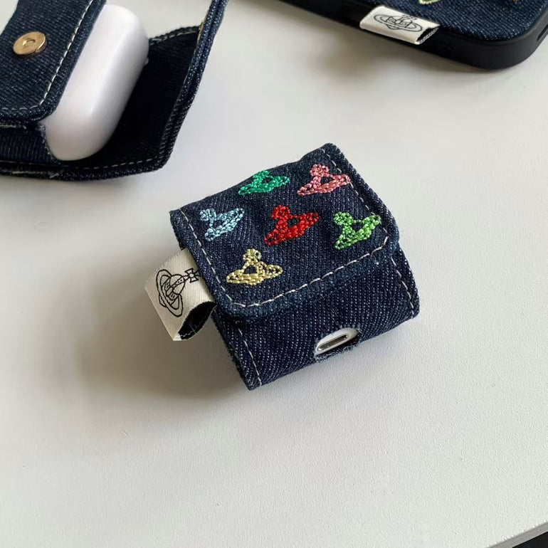 Embroidered Denim AirPods Case – Colorful Pattern Design
