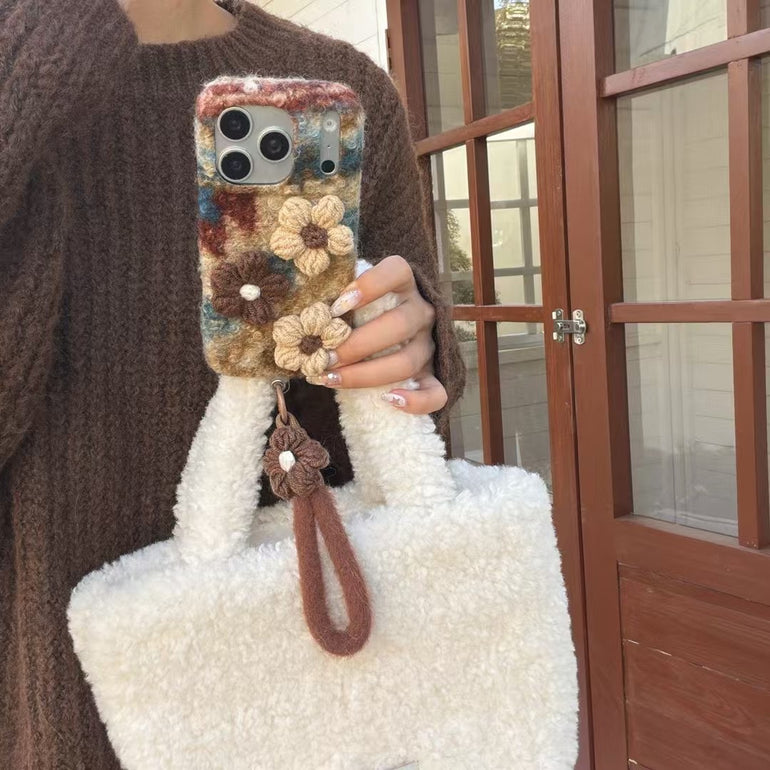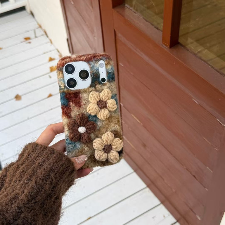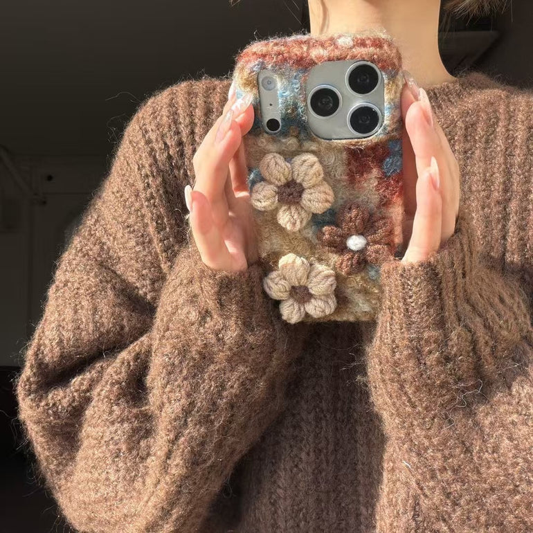 Give your phone a warm, cozy and aesthetic look with this handcrafted wool-texture iPhone case, beautifully designed with 3D floral detailing and a matching soft strap for a premium handmade feel.