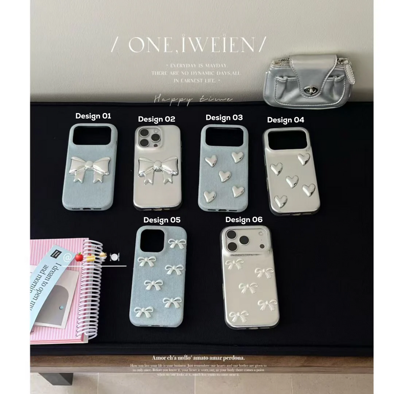 The Minimal Bow & Heart iPhone Case features a pastel base adorned with glossy metallic bows and heart accents, designed for a refined yet playful everyday look.