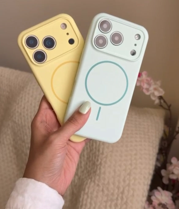 Upgrade your iPhone with these premium soft-touch silicone MagSafe cases, available in beautiful pastel yellow, mint green, and neon pink.