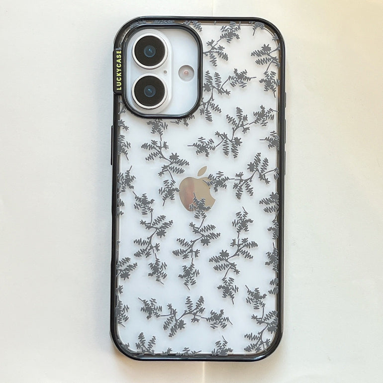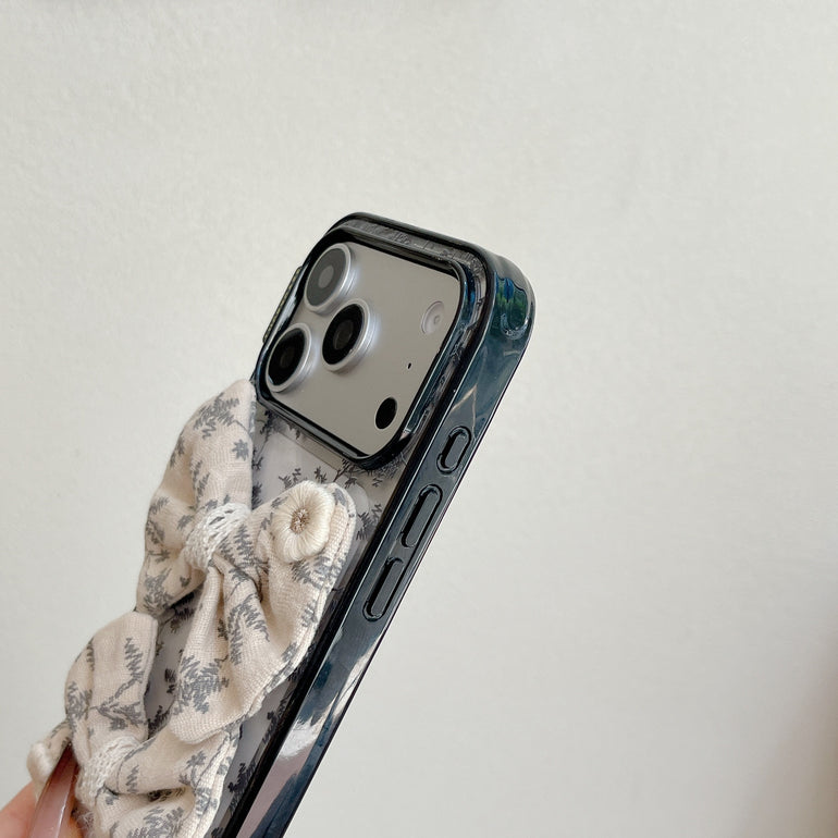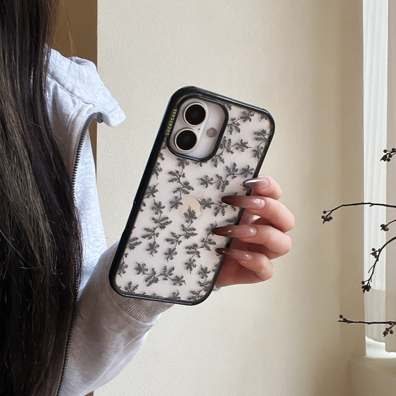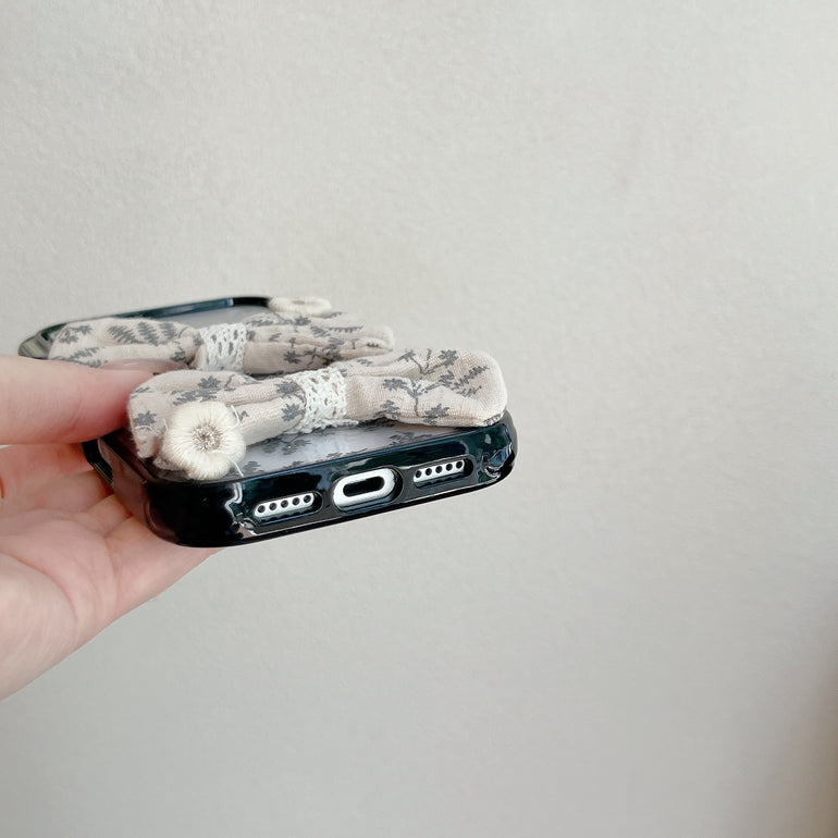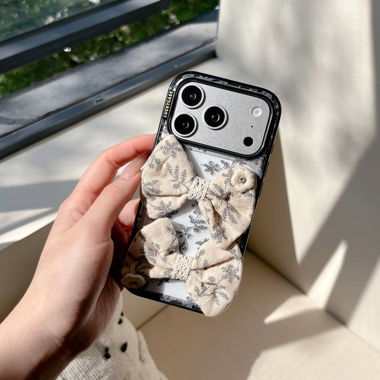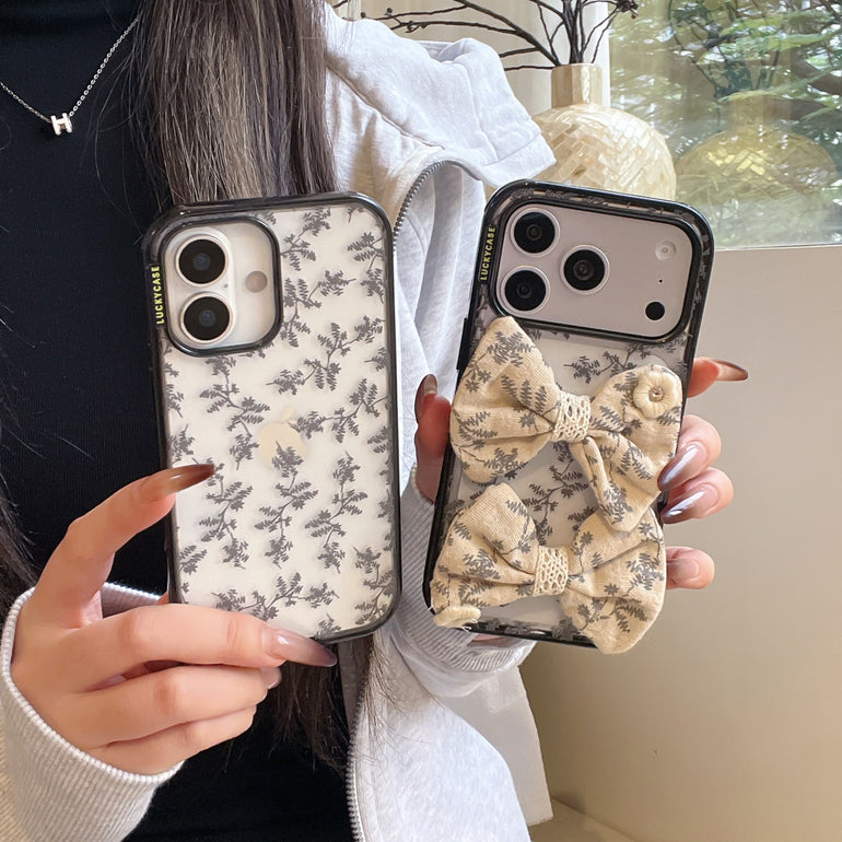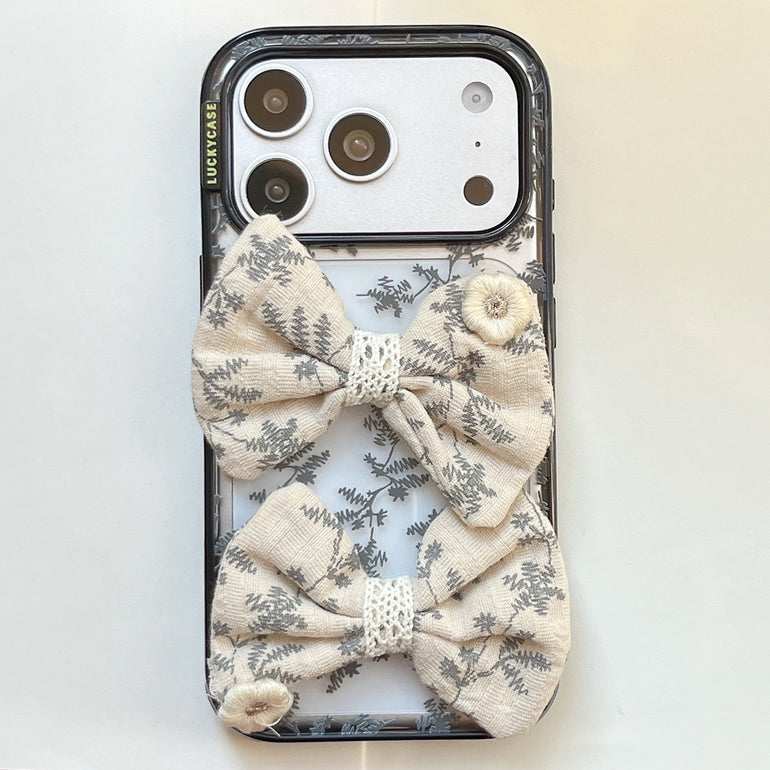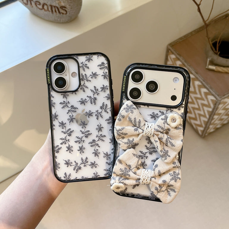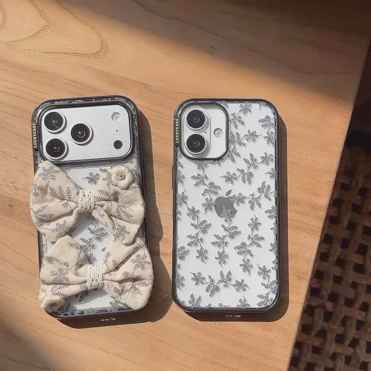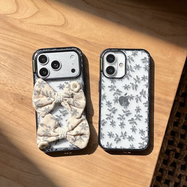 The Vintage Botanical Bow iPhone Case features a delicate grey leaf print on a transparent base, paired with soft fabric bow detailing for a refined, vintage-inspired look. Designed for those who love subtle aesthetics with a touch of charm.